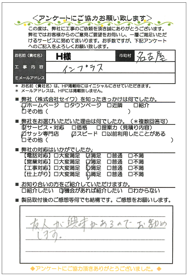 またH様より「友人が興味があるのでお勧めします。」とメッセージをいただきました。
